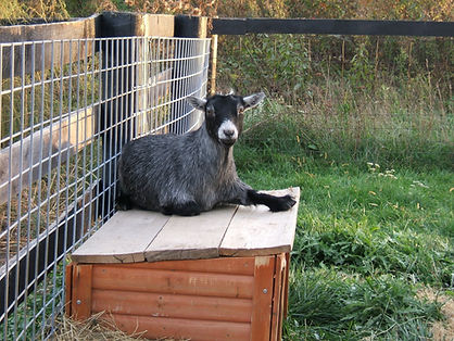 Petunia arrived with her mother (Priscilla, since passed away) in September, 2005. She was only eight weeks old. Priscilla was a good mother to her, but was also very protective of her. Petunia is most timid of all the goats. She will tolerate some grooming, but mostly will run away. She has her horns because we chose not to have them burned off. Petunia gets along pretty well with the other goats, although she will follow in her mother's footsteps in chasing them off at times.